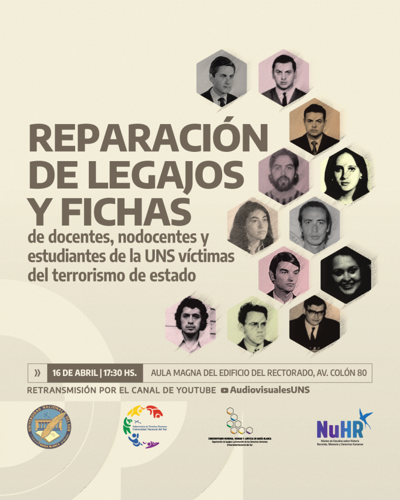 Sus vínculos con la UNS fueron interrumpidos como consecuencia de la persecución del terrorismo de Estado, entre 1974 y 1983, y por eso la institución ha decidido una instancia reparatoria. Que al menos en sus legajos laborales y fichas estudiantiles quede clara redacción de lo ocurrido: no abandonaron trabajos o estudios por decisión libre, ni por sanciones u otros artificios enunciativos, sino como consecuencia directa de un aparato criminal.